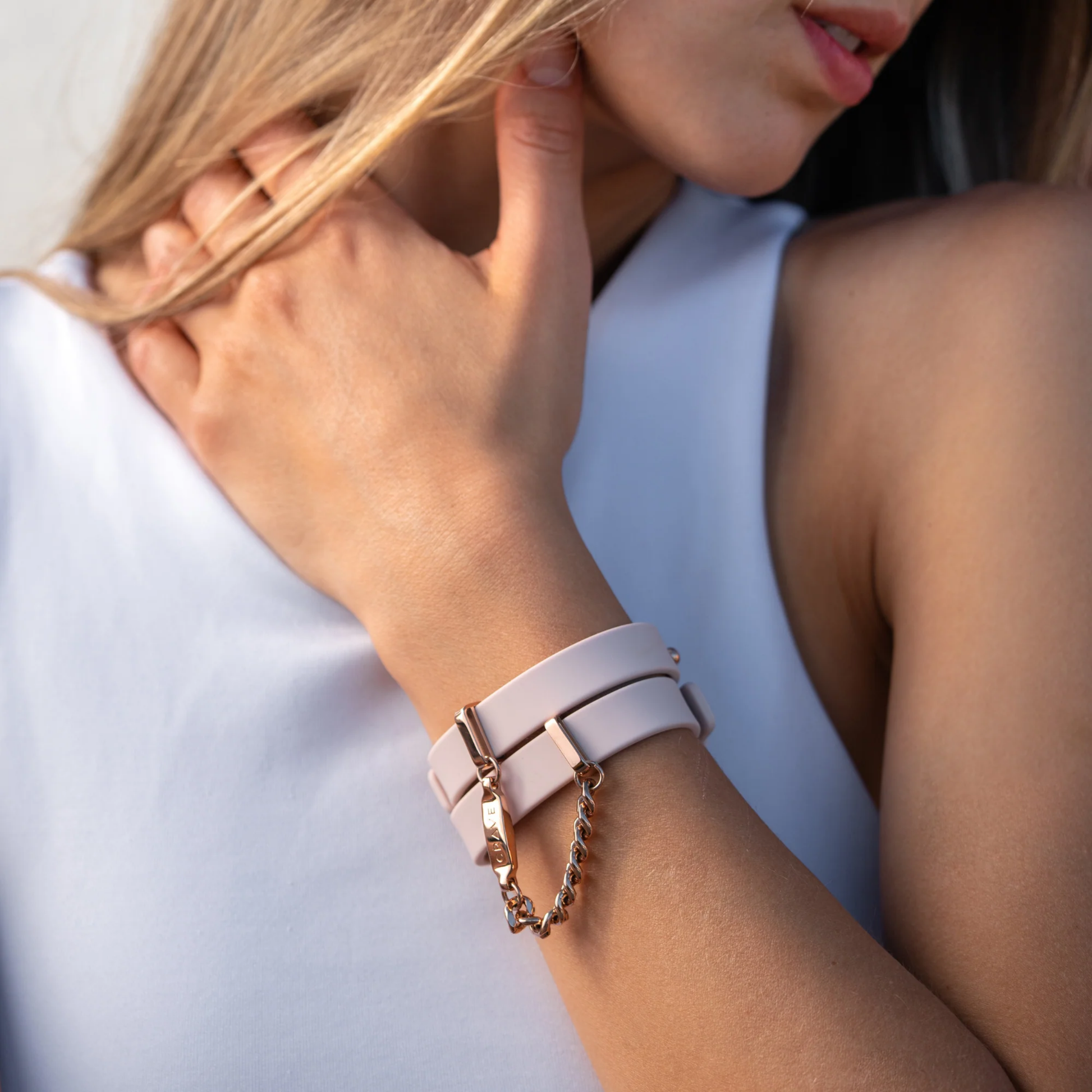 Wash necklace with non-silicone soap and water when fully assembled. Wipe Cuffs clean with a damp cloth. Do not use with silicone lube.