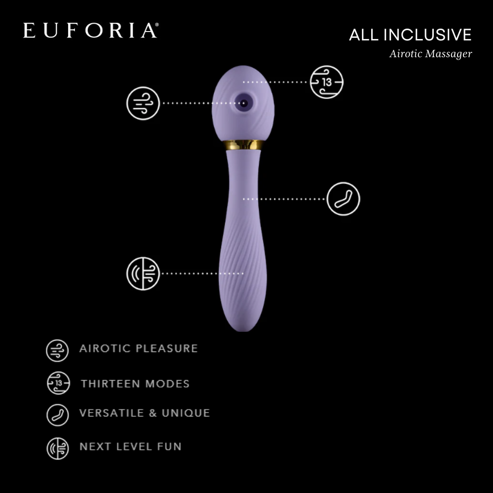 All Inclusive offers unforgettable amenities all packaged in a single perfect pleasure tool. First up is the innovative air chamber that uses air pressure changes to provide three speeds of airotic, oral-like stimulation. On the other end, is the silky-soft silicone shaft that features a spiraled texture and three speeds and seven rhythmic patterns of powerful vibration.