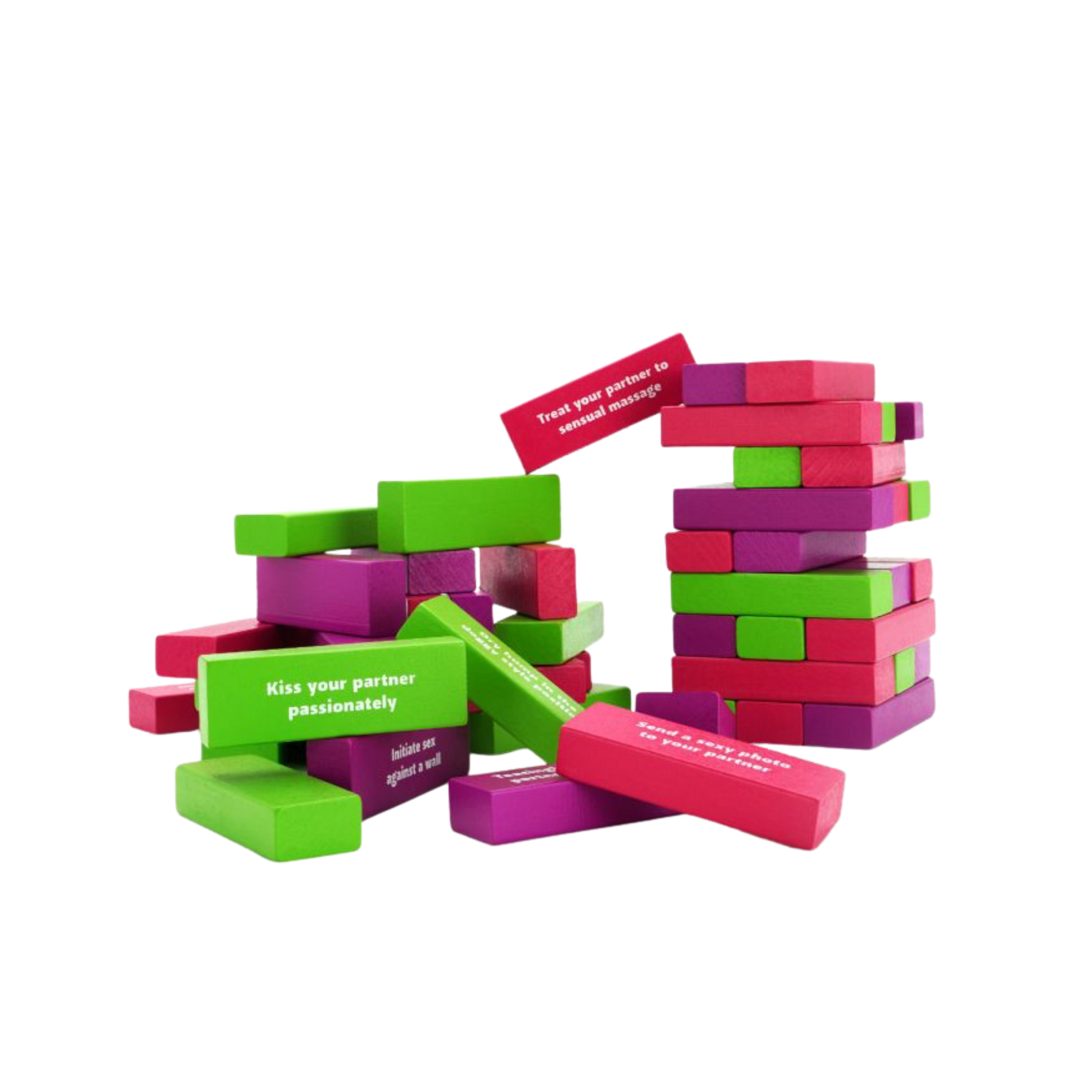 Remember that classic stacking game? Slowly remove blocks and when the tower falls the game is over. In this revamped and totally sexed up version, when the game ends the real fun begins! To play the Tower Of Pleasure, grab your lover and a few drinks. This game acts as the ultimate form of foreplay. Each block you remove dares you to perform a sexy act with your lover. Sexy pics, kissing, stripping, oral & more! Spend at least 15 seconds (we understand if you want to spend a little extra time) performing each naughty act to earn your points! Get more points for more daring tasks! In the end, the winner chooses how your sex goes down.